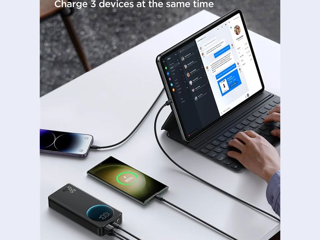 | شدت جریان خروجی | USB-C: 5V/3A, 9V/3A, 12V/2.5A, 15V/2A, 20V/1.5A (30W) USB-A1: 5V/3A, 9V/2A, 12V/1.5A, 10V/2.25A USB-A2: 5V/3A, 9V/2A, 12V/1.5A, 10V/2.25A USB-C + USB-A1 + USB-A2: 5V / 3A (15W) |