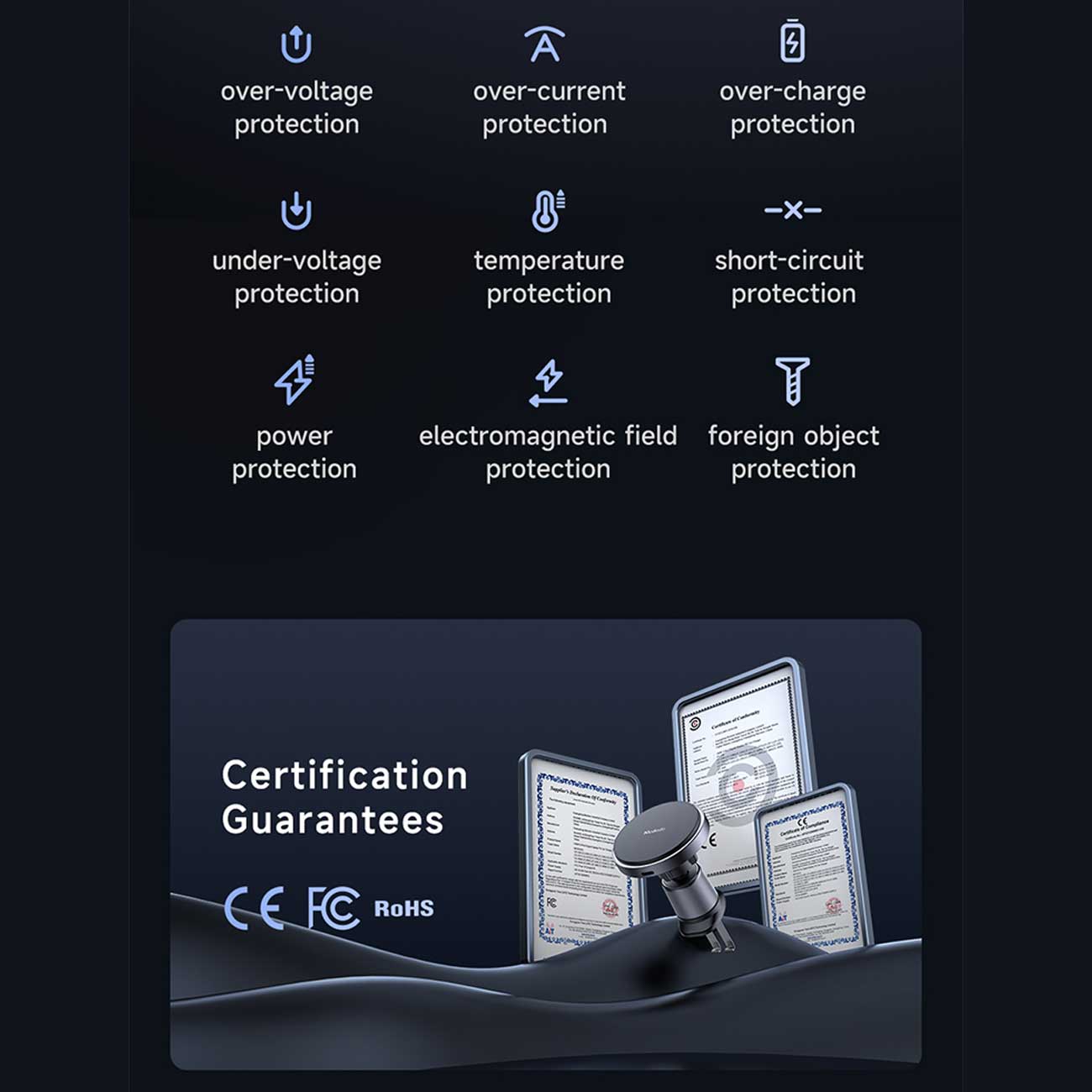 | سایر قابلیت ها | دارای فن خنک کننده قوی - نگهدارنده قدرتمند با آهنربا N52 - مجهز به حلقه نور LED - قابلیت شارژ سریع و ایمن - پشتیبانی از توانهای 5W/7.5W/10W/15W - ورودی تایپ سی: 5V-3A، 9V-3A |