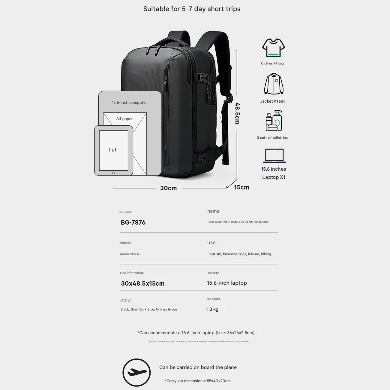 | اقلام قابل حمل درون کوله | لباس (4 دست کامل + 1 لباس بیرونی)، کفش، حوله، لوازم بهداشتی، لپتاپ، آیپد، شارژر، هدفون، اسناد A4، بطری یا چتر |