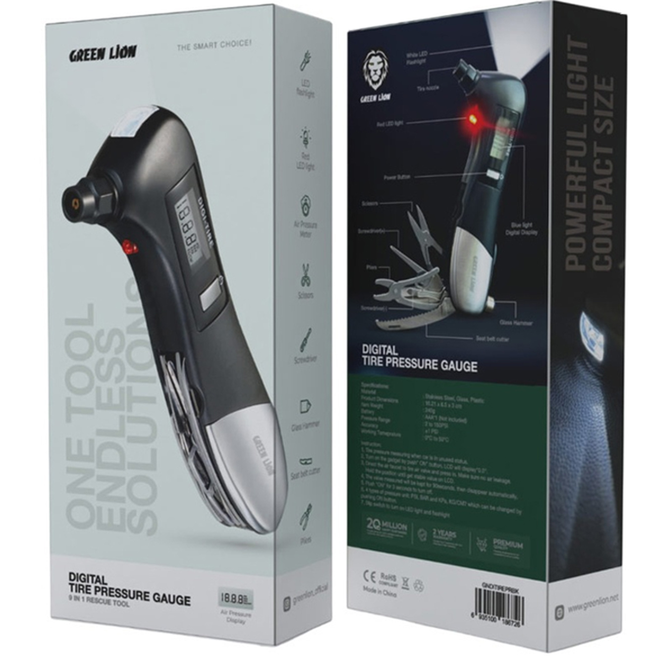 Green Lion GNDITIREPRBK Digital Tire Pressure Gauge 9 In 1 Rescue Tool