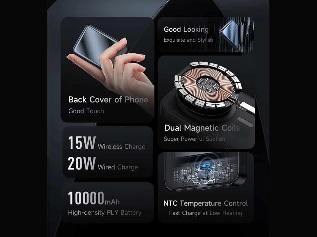 | امکانات و قابلیتها | پاوربانک مغناطیسی، شارژ سریع، هولدر گوشی مکانیزم مغناطیسی، MagSafeپاوربانک قدرتمند، ظرفیت بالا 10000 میلی آمپرپشتیبانی از شارژ بی سیم 15 واتی و شارژ PD 20 واتیپوشش سطح سیلیکون مایع، لمس نرم و ضد لغزش |